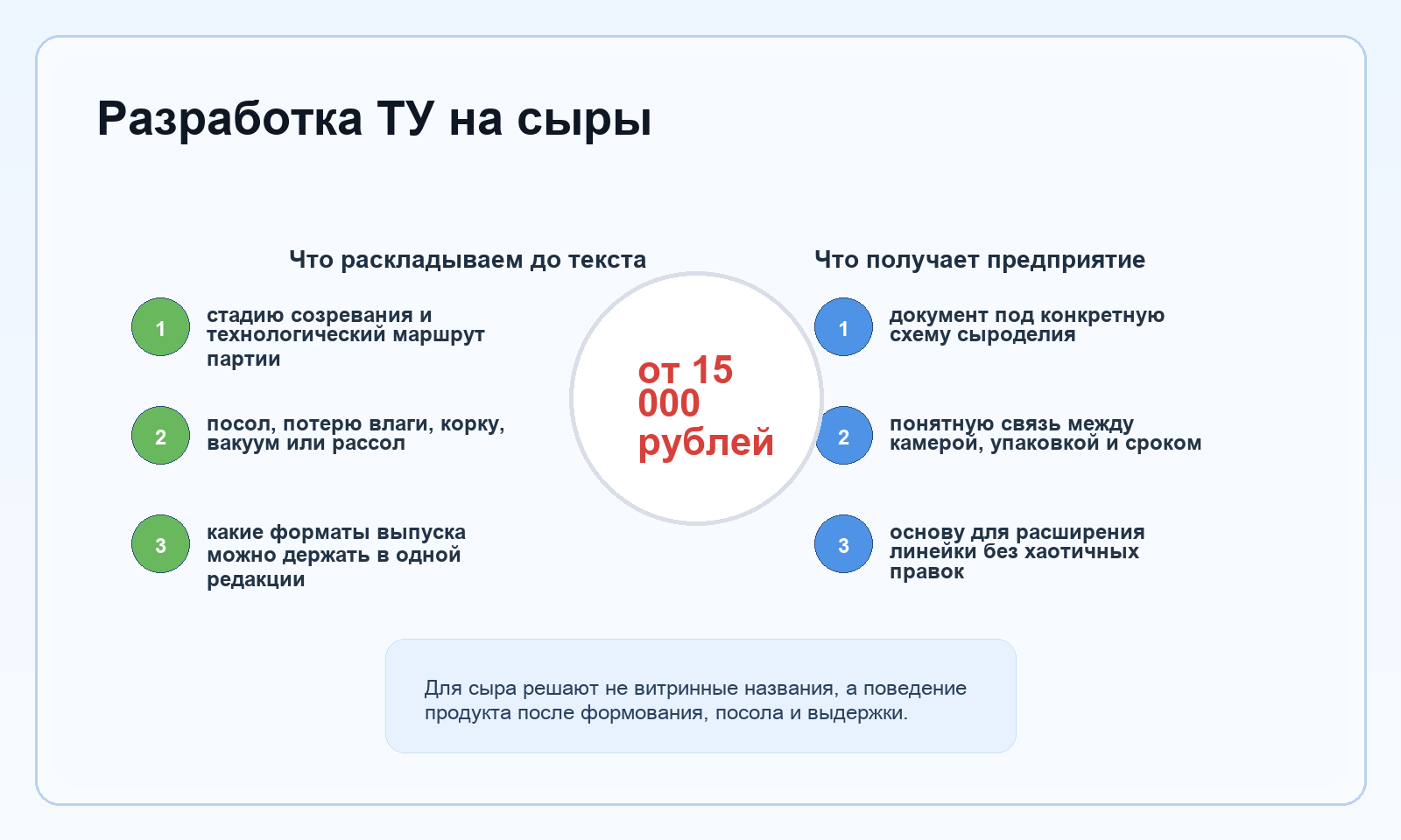 У сыра слишком длинная жизнь между выпуском и продажей, чтобы ограничиться перечнем ингредиентов. Для одной и той же линейки критичны формование, посол, выдержка, поверхность, потеря влаги, переход в вакуум или рассол и уже потом этикетка. Если технические условия не учитывают этот путь, документ перестает описывать продукт уже на уровне камеры созревания.