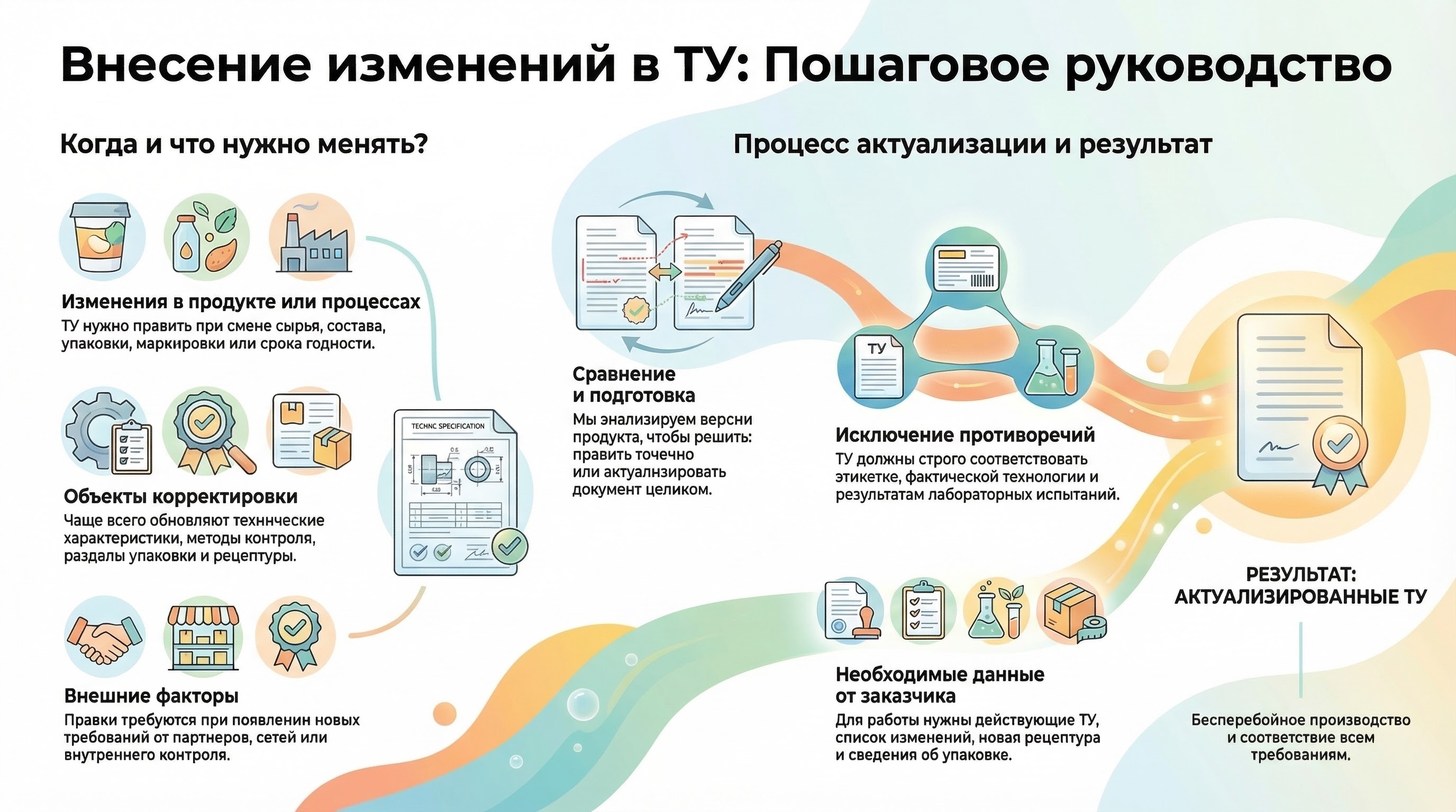 Отправьте текущие ТУ и перечень изменений. Мы быстро скажем, где хватит точечной актуализации, а где безопаснее пересмотреть документ целиком.